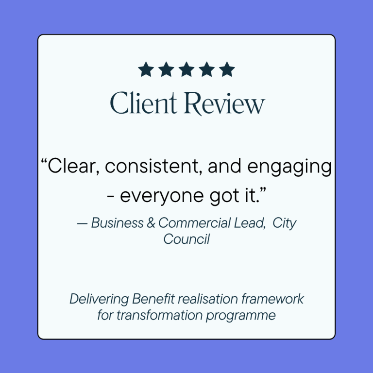 - Value Led Delivery - We move teams from output-driven to value-led. By implementing frameworks like SAFe and customised Benefit Realisation, we ensure every workstream is mapped to a measurable corporate objective, eliminating the start everything, finish nothing behaviours.